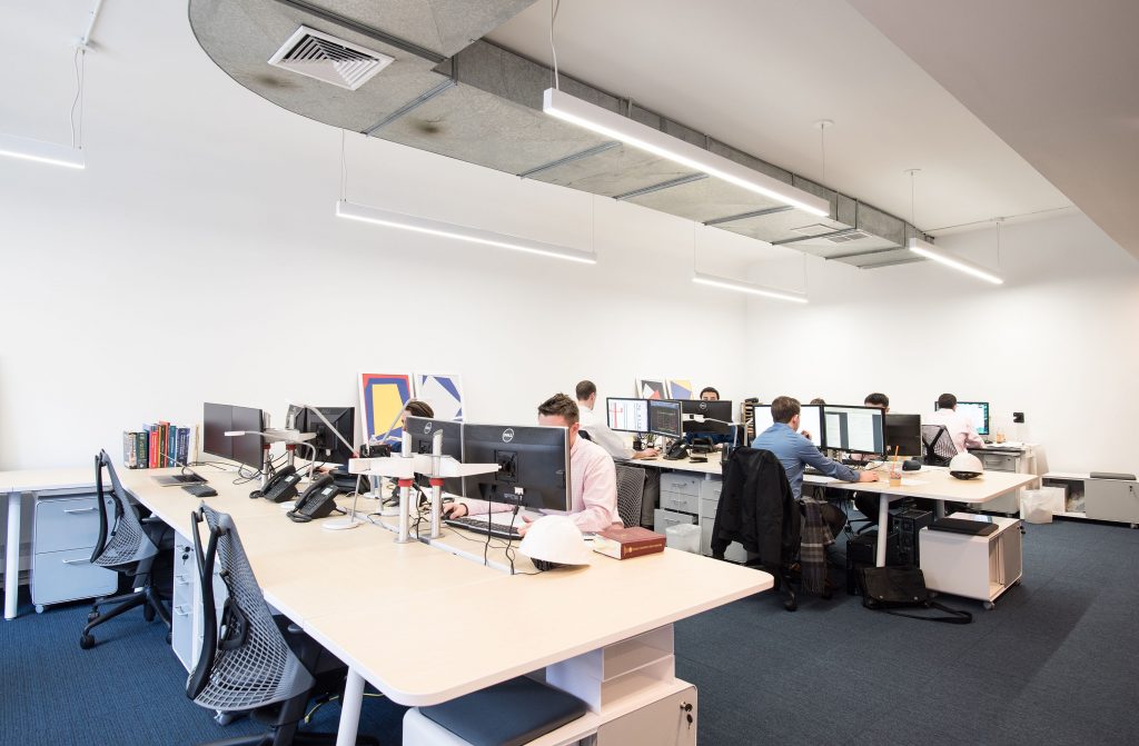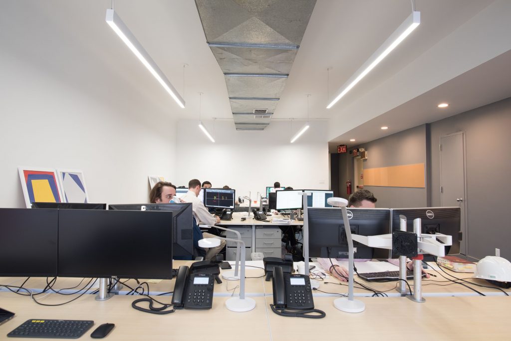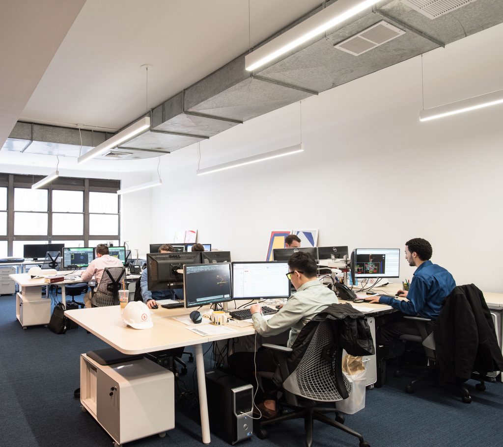 In this project we transformed a former law office into a bright, modern home for a growing structural engineering firm. Existing partitions were removed to bring daylight into the space and create an open floor plan to maximize flexibility and facilitate collaboration between engineers. We selected a modular furniture system that can be easily reconfigured as staffing needs change. The existing bathrooms and communal kitchen were also completely renovated. The project was completed on an extremely tight budget and schedule.