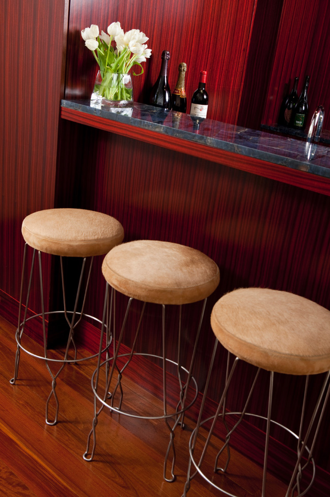 This renovation of a private residence in Manhattan focused on the combination of two separate apartments and the transformation of an unoccupied roof into a large terrace. The sills of existing windows were dropped to allow for patio doors from all spaces, making the new terrace the center of activity within the apartment. The demolition of an existing bathroom and demising walls created a large open room for relaxing and entertaining. The most remote portion of the combined apartment was kept as a private “sanctuary,” complete with its own private bathroom and bar.